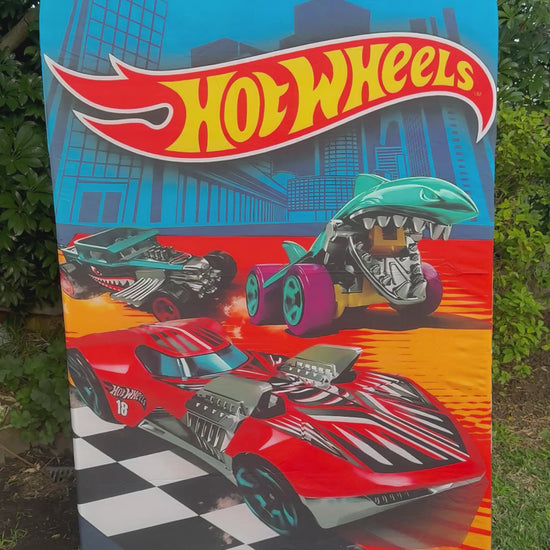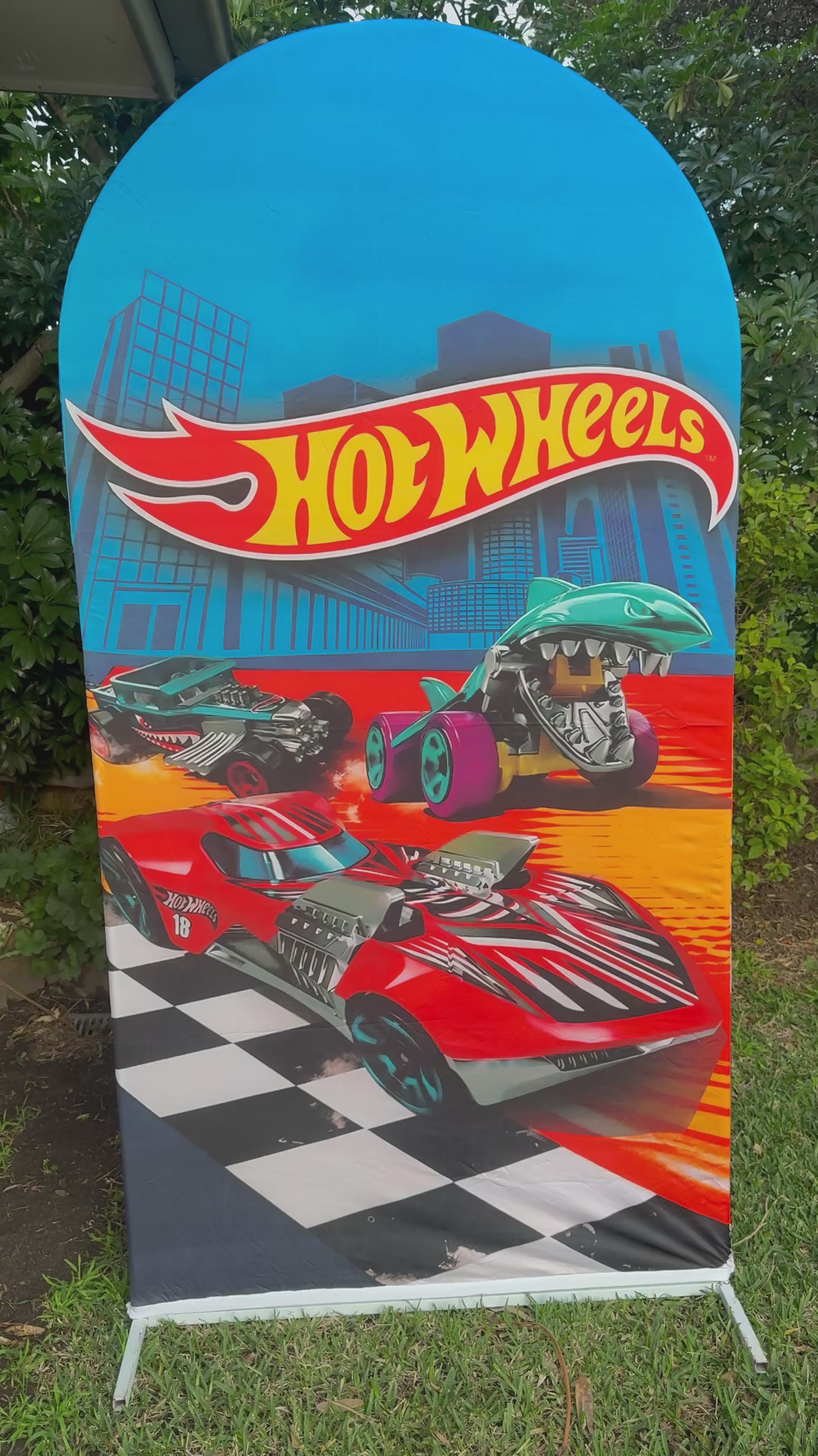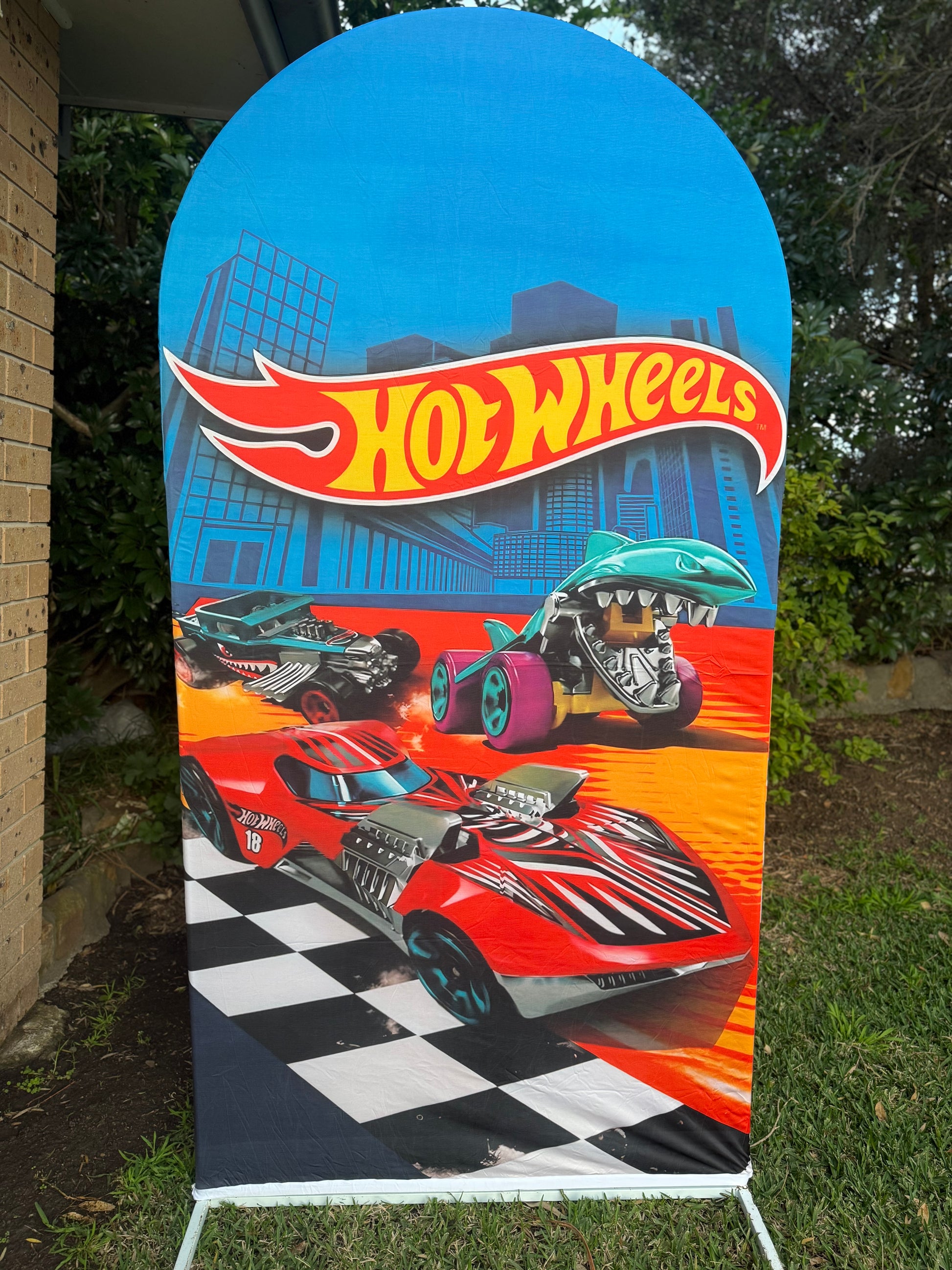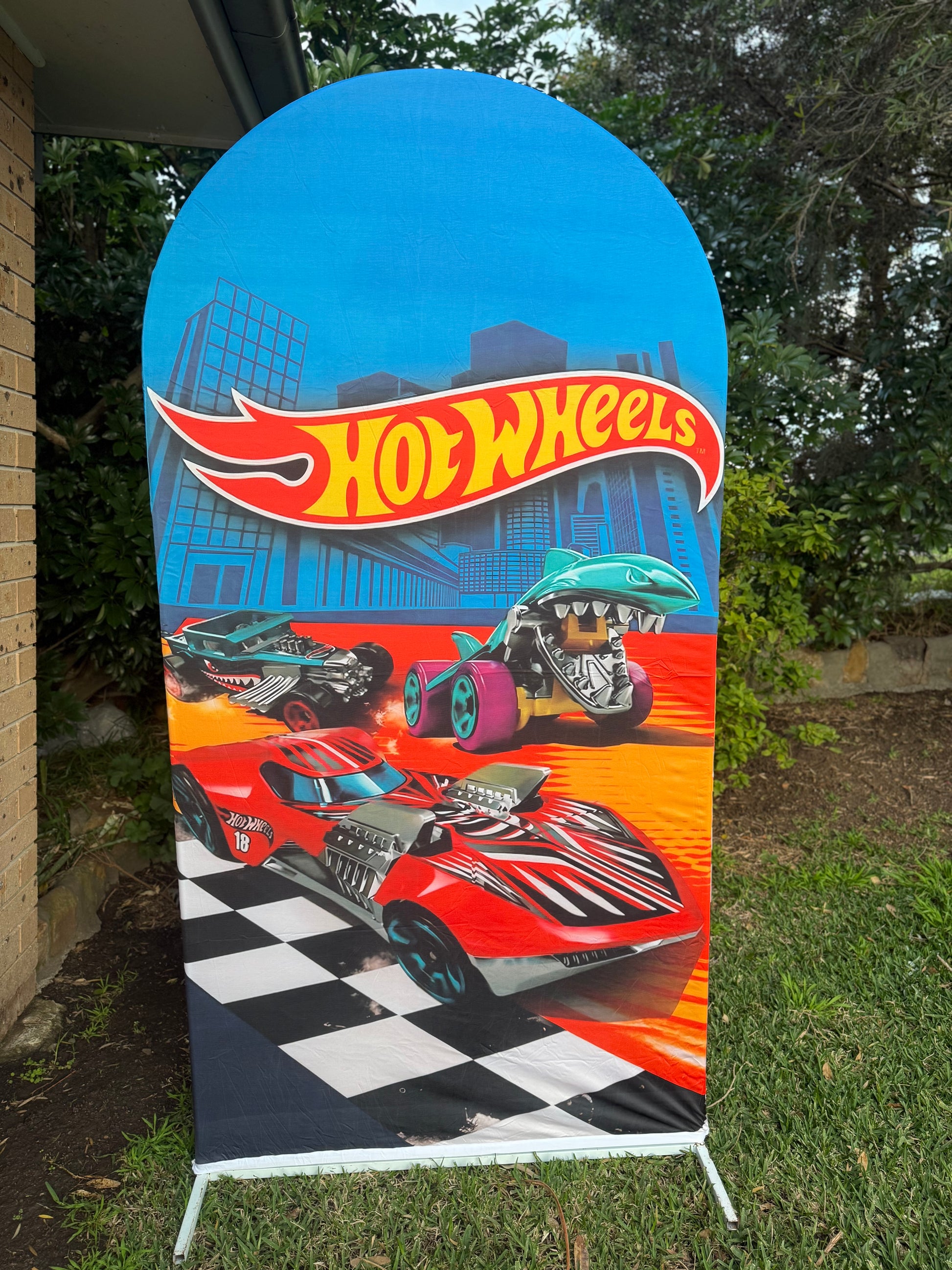 Book separately, custom sticker, white plinths, backseat balloon garlands (also you can add checkered half arch or circle banner to the hot wheels arch or add the hot wheels arch to the checkered circle banner)